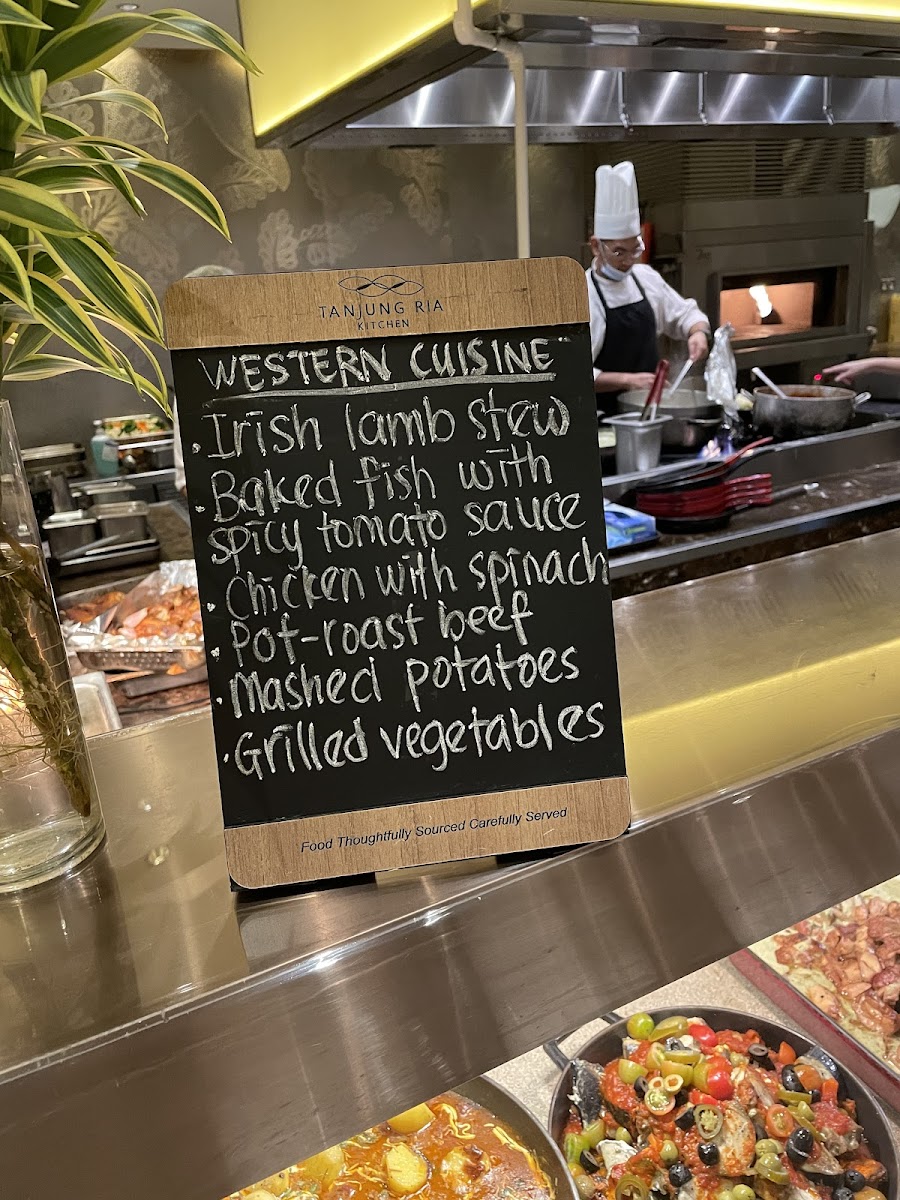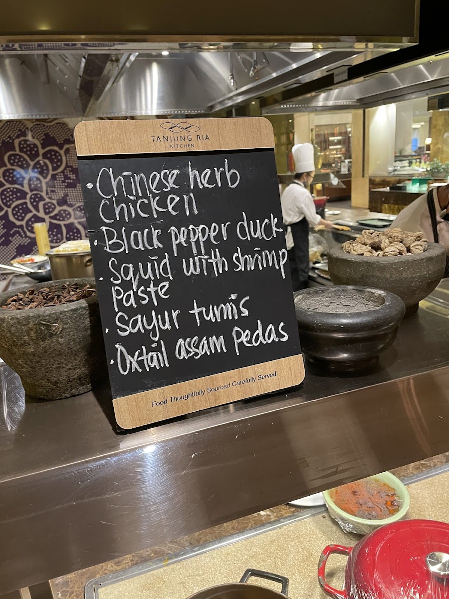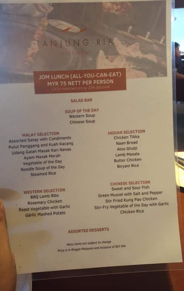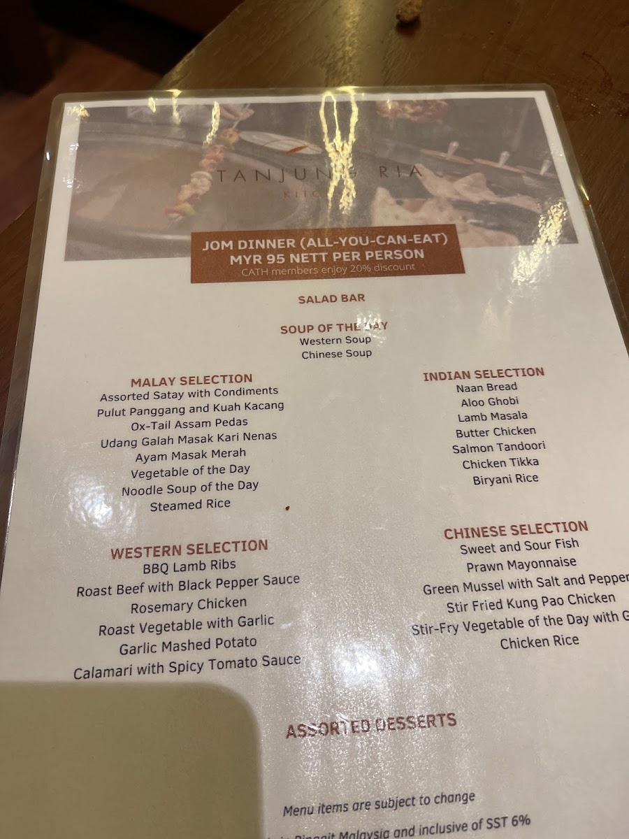 Tanjung Ria Kitchen offers a spacious ambiance with stunning bay views, creating the perfect setting for family dinners or special occasions. Guests can explore a lavish spread that includes salads, delectable desserts, and flavorful curries, ensuring a memorable culinary journey. Attentive service enhances the experience, with staff ensuring glasses are filled and plates cleared efficiently. While some express a desire for broader options during weekdays, the quality and presentation of food remain impeccable. Join us for a buffet that not only satisfies but delights your taste buds, truly worth every penny!